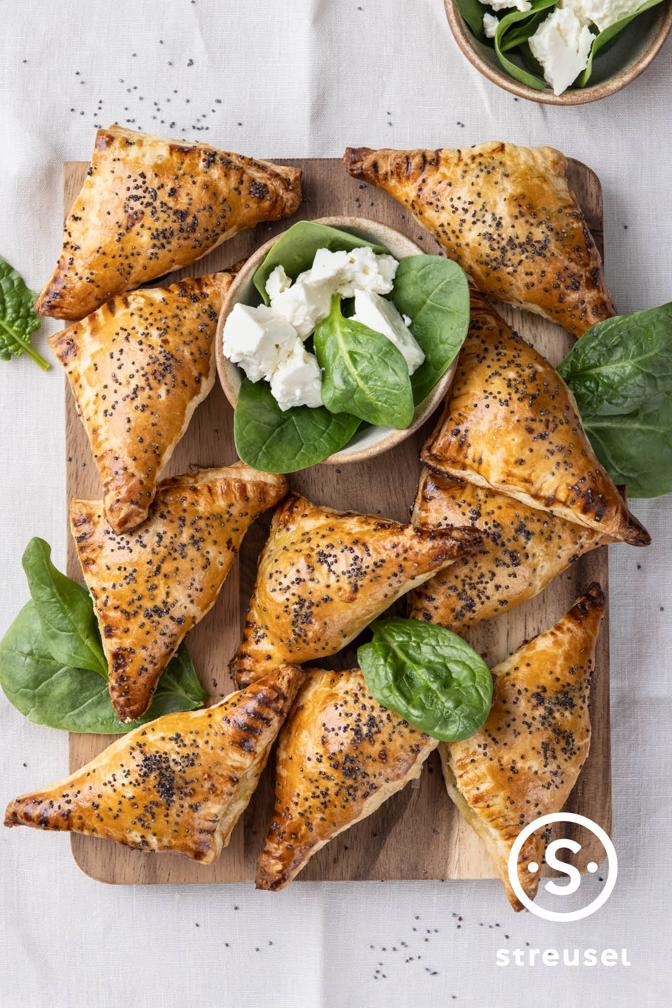 Rezept für selbst gemachte Spinat-Blätterteigecken mit Feta.